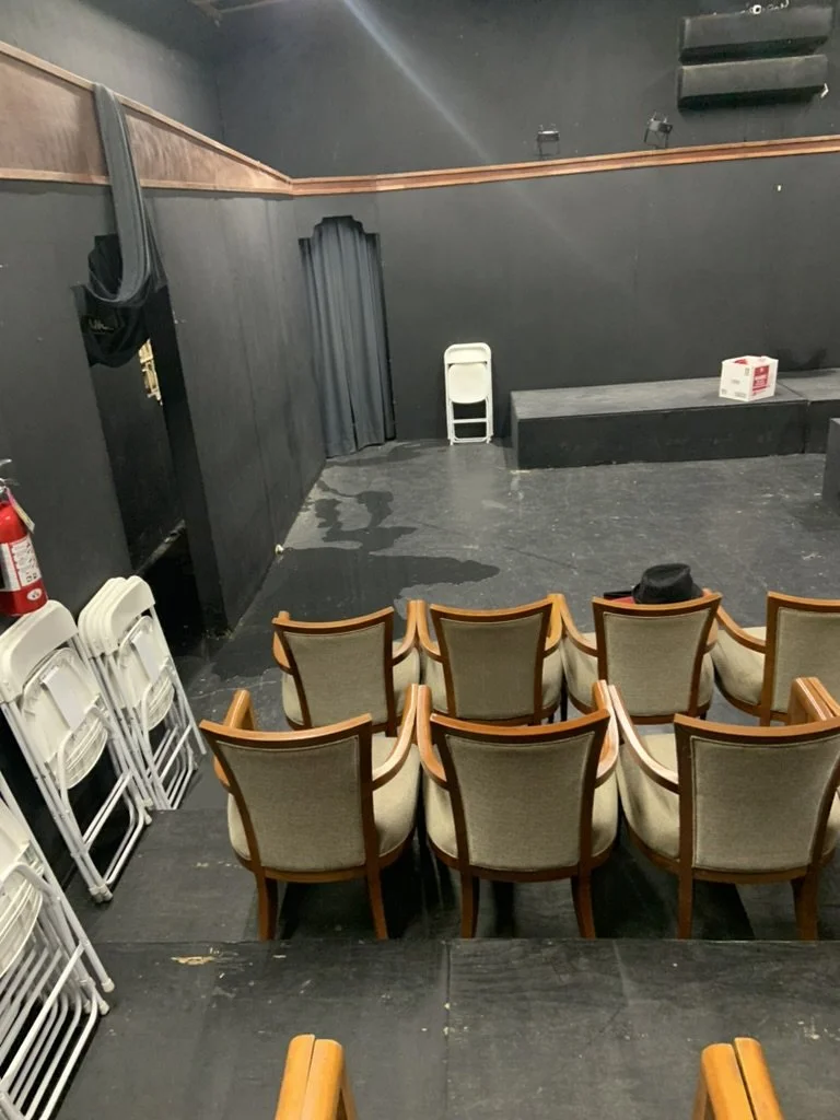 But the Black Box needed tender loving care. For one thing, there were leaks which were getting more and more dramatic. When it rained, water would get through the outside in various ways. One of them was a weird sort of alchemy; we would walk into the theatre and have to wade through puddles of water which gathered along the western wall and seeped under the walls to spread across the stage floor. We eventually traced that issue to a leaking gutter which seeped into the wall around the old windows and then came down the walls. Another was a leak which formed in the backstage area, dripping onto and around an ancient filing cabinet which eventually began to rust as a result. The third was the most spectacular. It appeared on the stage itself, somewhere around downstage left, and regular patrons will remember the matter of fact ways in which casts learned to bring in chamber pots and buckets while performing their parts, place them down, or even—once or twice—flip open an umbrella when the scripts called for it.